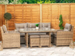 Built with an aluminium frame that cannot rust, this 6-seat brown rattan sofa dining set can be left outside all year round with no cover needed. You get a 67cm-high dining table, 10cm cushions, two ottomans, and delivery included.