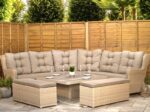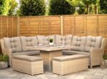 This 10-seat corner sofa set uses an aluminium frame that cannot rust, so you can leave it outside all year round. With a 300cm x 300cm footprint, two bench ottomans and a height-adjustable ceramic tile top table, it’s built for everyday use.