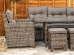 You get a proper dining-height table here, not a low coffee table pretending to do both jobs. The table stands 67cm high, so you can actually eat outside in comfort, and the 5mm clear tempered glass top handles British temperature swings far better than standard glass. In the box you’ll get 1 dining table, 1 lounge dining sofa, 2 two-seat lounge dining chairs, 2 ottomans, plus 10cm-thick seat and back cushions in dark grey.