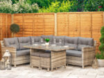 This corner dining set uses an aluminium frame that cannot rust, so you can leave it outside all year round without needing a cover. You get seating for 6, a 67cm dining-height table with 5mm tempered glass, and 10cm thick cushions included.